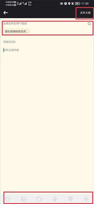 然后在编辑界面中搜索你要发布内容所属的版块,选择完成后将发布内容、标题等编辑完成后点击右上角发布主题即可,用户若要在内容中添加图片、视频、表情包等可以在下方菜单栏目中进行添加