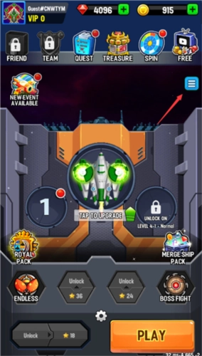1、打开银河之战深空射手,进入主界面,选择【三条杠】图标,