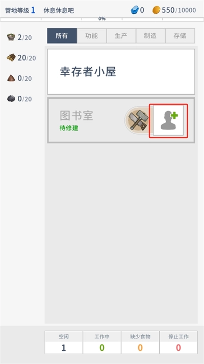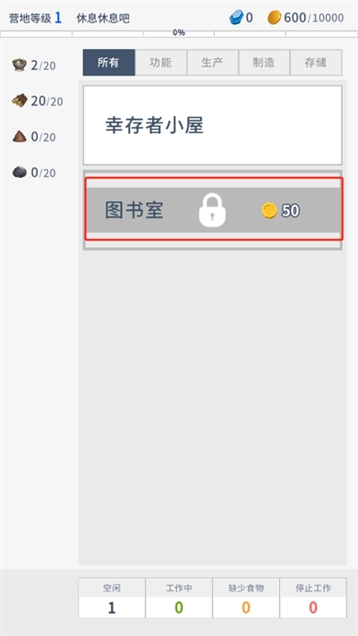 3、进入后将会看到需要再营地建设更多的建筑,我们开始只有图书室可以建造;