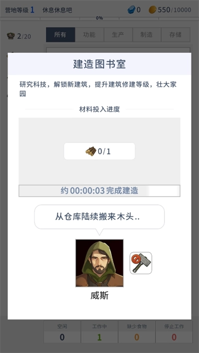 5、在这里找到空闲人员后,系统会自动开展建筑修建工作,请注意建筑修建需要材料,你要确保材料储备充足。