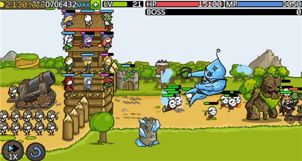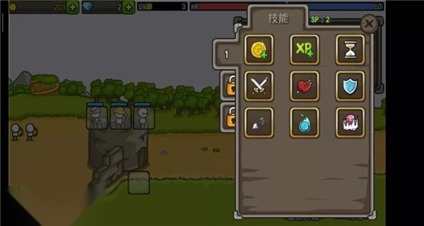 8、战斗中技能使用:在成长城堡战斗的时候点击城墙上的英雄即可释放英雄技能,释放技能需要消耗mp,同时进入长时间的冷却,最好在怪物密集或者boss时候使用技能。