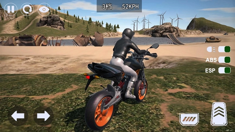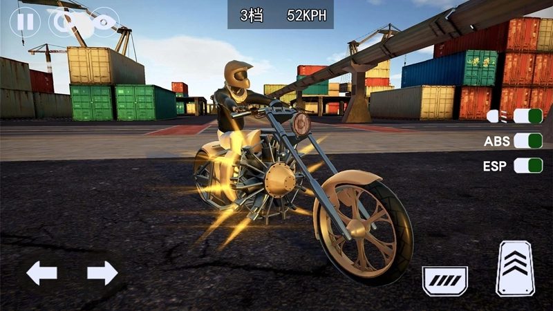 1、挑选自己喜欢的摩托车进入场景,借助屏幕上的虚拟按键来控制摩托车的前进、后退以及转向动作。