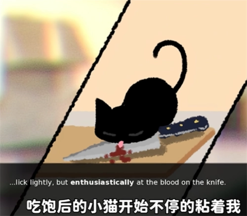 5、猫咪的异常行为升级,开始舔舐一把沾满血迹的菜刀。