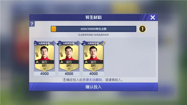 转生既然有这么多的好处,那么我们该如何转生呢?首先每个球员的转生需要消耗转生点数,具体量视球员的品质而定。而我们想要获得转生点数,则需要消耗同名球员即可,一般来说,球员的一转只要1张同品质的同名球员,二转或以上的话则需要更多同名卡。要注意的是,即使是不同品质的同名球员,也是可以消耗获得转生点数的。比如一张S级的郑智,可以消耗多张A级郑智进行转生。