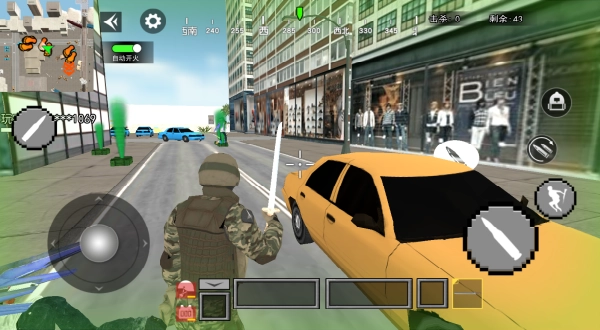 2、滑动左轮盘移动,右轮盘瞄准,点击开火按钮射击,利用掩体规避敌方火力。