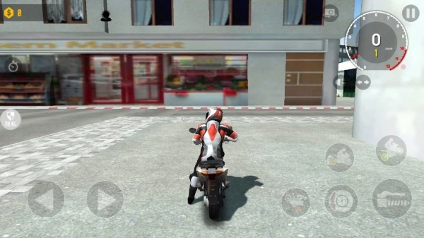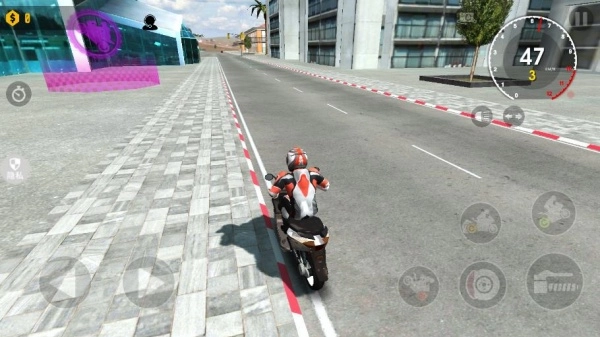 2、操控摩托车穿越城市街道、空中轨道等复杂地形,灵活切换视角视角,精准控制行驶方向与速度平衡。