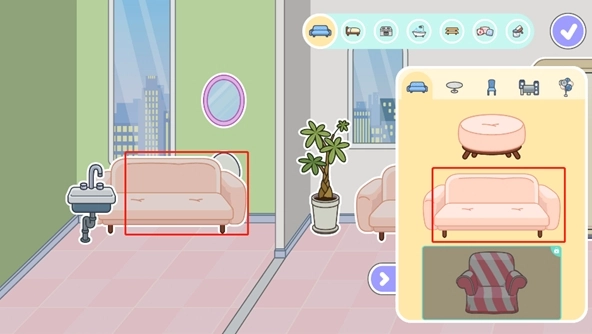 4、里面为用户提供了非常丰富的家居,如沙发、桌子、洗手台、床、浴缸等等,玩家可以自己选择你想要的家居;