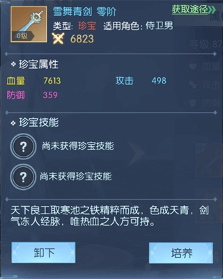 在随从界面,点击已穿戴珍宝,弹出珍宝信息界面,可查看珍宝阶数、适用角色、战力、珍宝属性、珍宝技能等信息。珍宝的血量、攻击、防御三个属性会在获取珍宝时随机生成,且属性品质会根据初始属性和升级属性共同决定,随着升级属性提升,属性品质也会随之提升。