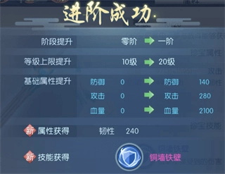 每次进阶成功后必定获得1个不随珍宝升级而提升的新属性固定值,且有一定概率获得1个稀有的珍宝技能,但作为进阶材料的珍宝技能不会继承至主珍宝上哦~
