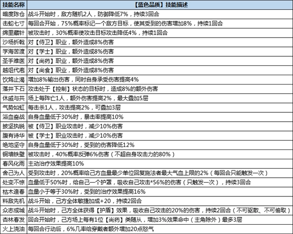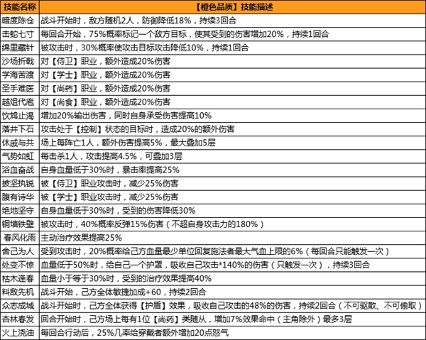 各品质技能效果:橙色品质技能效果紫色品质技能效果蓝色品质技能效果,详细技能效果可查看具体技能描述: