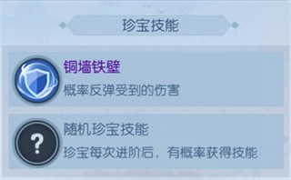 珍宝每次进阶后,都有一定概率获得1个随机品质的随机珍宝技能。珍宝技能品质分为蓝、紫、橙三种,已获得的珍宝技能品质和效果都不会再发生改变。每个珍宝技能上限为2个。