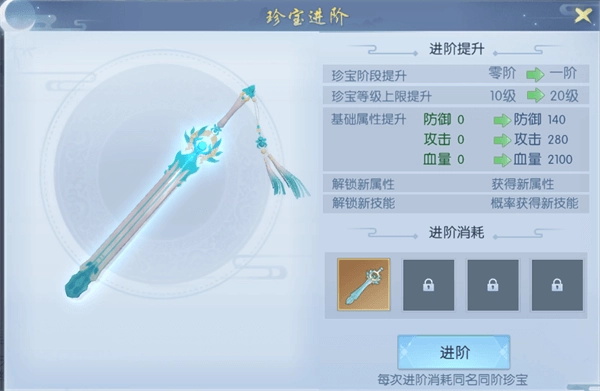 在“进阶消耗”区域内的格子中选择放入同名同阶珍宝,即可进阶。进阶时,作为进阶消耗材料的珍宝在到达与进阶珍宝同阶时,无需进行额外升级,进阶完成后将提升珍宝的整体属性。