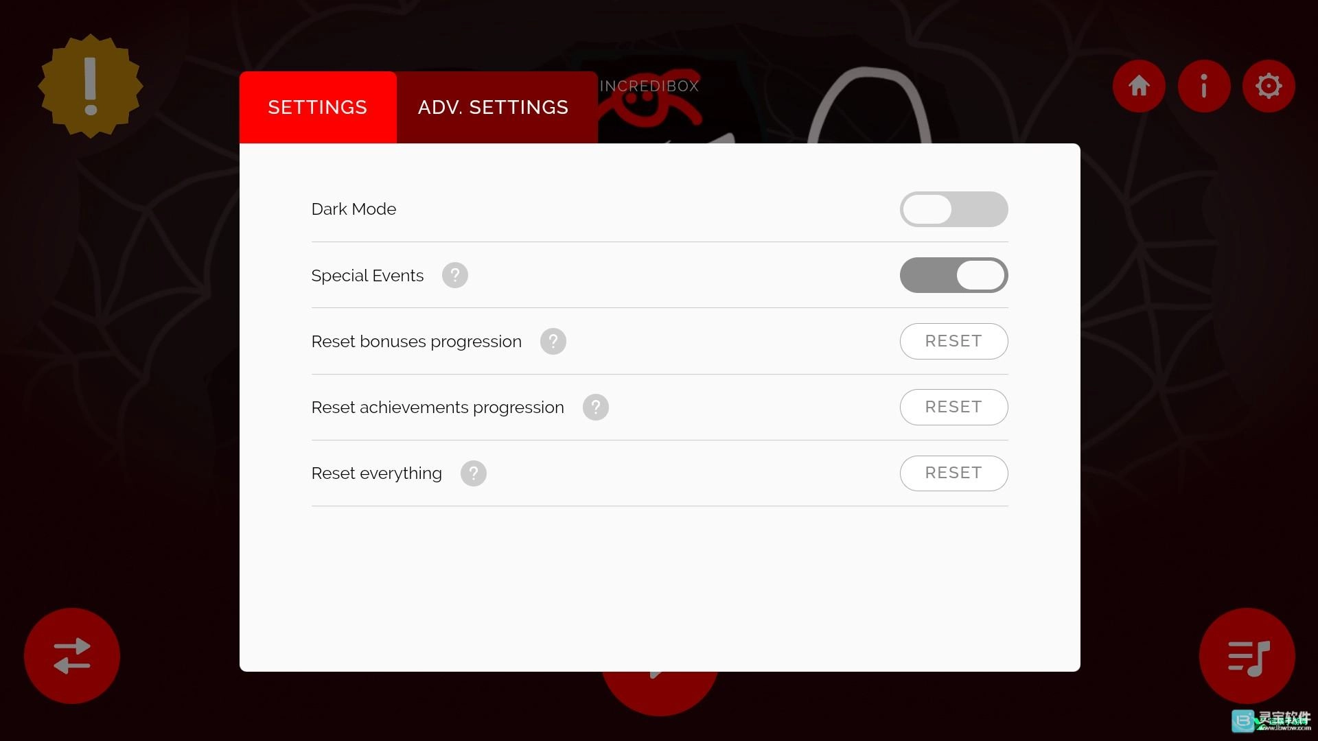 3、右上角设置中可以查看各种设置内容,包括黑色外观、重置、特殊事件开启以及各种音乐设置;