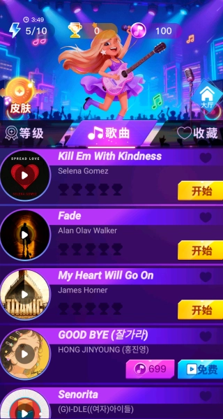 4、完成歌曲演奏后,可借助“皮肤”功能更换角色外观,同时关注“等级”模块,累积演奏次数提升等级。