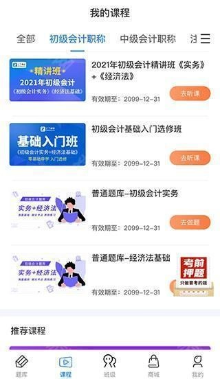 1、打开软件登录之后,点击底部菜单栏“课程”按钮,即可看到已经激活的课程,点击“去听课”按钮即可听课。