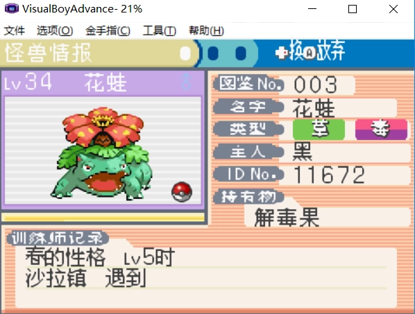作为初始三选一的宠物之一,妙蛙花属于草系,是叶绿版本的代表精灵,能够有效克制岩石系与水系怪物。后期技能包括烈焰阳光、叶子切、藤鞭以及吸收等。
