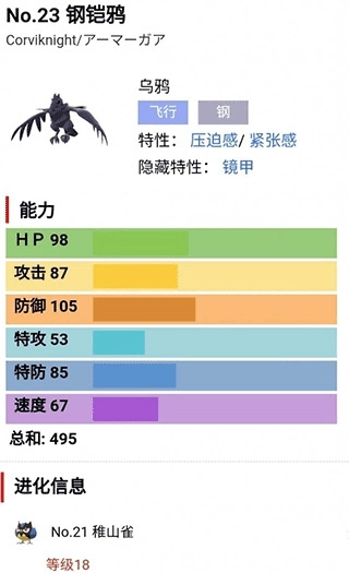钢铠鸦是由稚山雀进化而来的宝可梦,它不仅生存能力非常出色,拥有105的防御、85的特防和98的HP,其飞行和钢的特性,也使其打击面非常广。大家前期还是非常有必要获取它的哦。