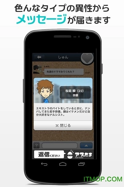 请回短信是和32个虚拟角色互发消息!抖S抖M任你选!男神不会少!女神也不会缺!屌丝再也不用怕女神说去洗澡啦!用发短信的方式玩GALGAME攻略是不是超有意思呢?