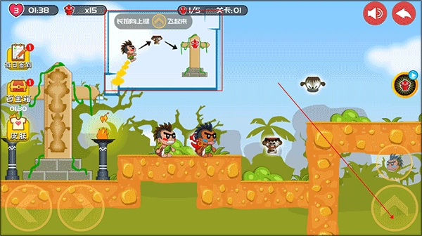 一个人到右侧的拱洞下面吃红色的那个宝物,另一个人去取左上角的宝物,可以连放屁2次上去或者先跳到右侧的台阶上再往左侧。将宝物放回后跳上台阶往右走,从图册中可以看到这里有野猪出没,所以要小心些。为了轻松过去而不碰到野猪,可以先等等。当野猪往右走的时候,可以跳下去在后面跟着往右走,但是不要跟的太近,如果野猪突然回头那可就危险了。到野猪回头的时候就放屁往右侧飞。右侧的界面如图,如果放屁的功夫不错的话,可以直接从左侧的台阶上往右飞的话可以直接避过野猪,不过如果放屁的功夫练得还不到家那么就算了。