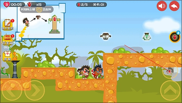 然后一个人吃掉右侧的宝物,接着走到按钮一样的开关上面。这个时候上面的机关会打开,另一个没有宝物的人放屁飞上去取走宝物。注意左侧还有一个宝物,待会儿还要取走。回来的路上不要心急,不然碰到野猪那就不好了。可以直接从右侧放屁飞到左侧,为了保险最好等野猪往右侧走的时候往左侧飞。