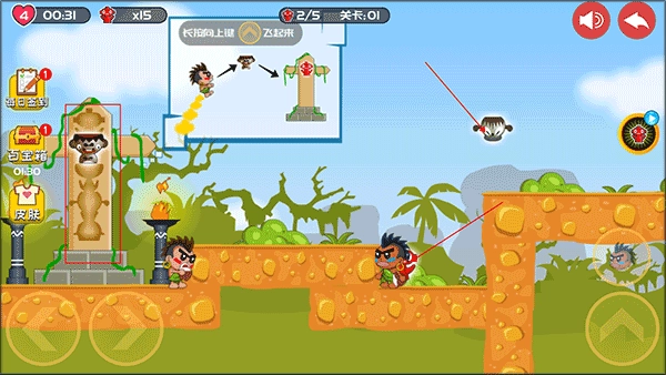 开始后一个人到左上角去取宝物背回到祭台,另一个人去打开右侧的开关,就是图册红色圆圈里面的那个骨头模样的地方。开关推到右侧上面的石柱就会下降出现一个通道,这时候跳上去,然后向下走,取走右边的这个宝物。另一个人下来放宝物到祭台。