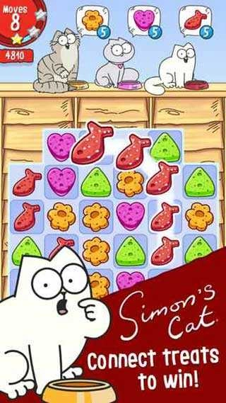 西蒙的猫改编自同名热门动画系列,是一款轻松有趣的连线消除游戏。故事中,馋嘴的西蒙猫刚把零食摆好,就被狡猾的乌鸦一口叼走,急得直跺脚。它得通过滑动屏幕连接相同的食物图标来通关,只有每关都达成三星目标,才能夺回心爱的点心。游戏操作简单易上手,不过关卡设计多变,障碍物与特殊道具的组合让挑战逐步升级。
