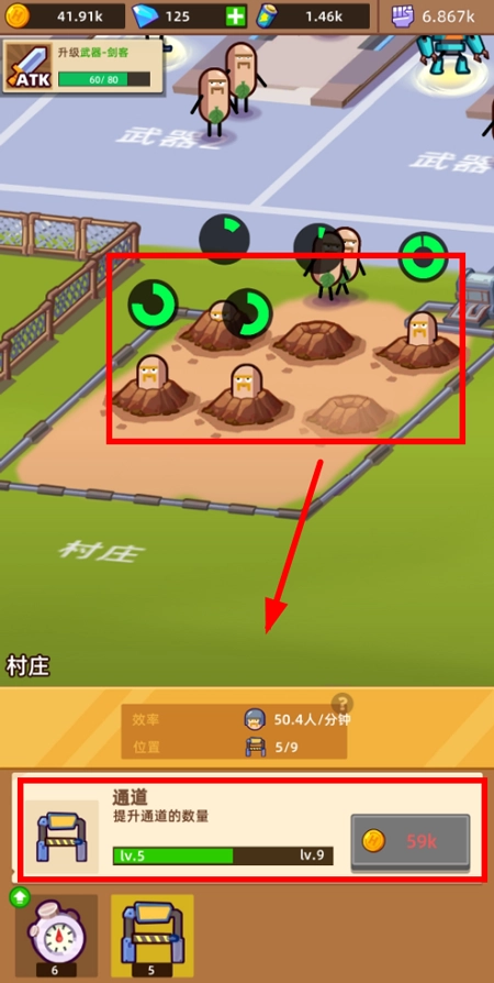 村民沿路径自然汇聚至工厂入口,路径数量与通行效率决定兵员产出节奏。击败怪兽所获金币,是拓宽路径、延长通行时间的核心燃料。