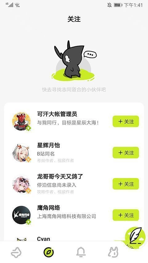 2、进入关注界面,可看到当前关注的用户,也可以选择画师、视频作者、攻略作者等用户关注,