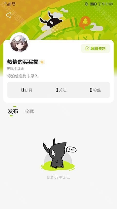5、进入个人中心,可以查看详细的获赞数、发布数、关注数、粉丝数和收藏数等内容,还可以编辑用户资料,