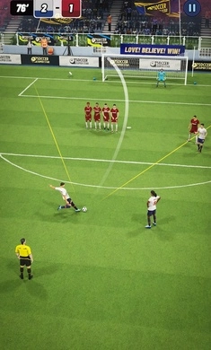 1、游戏开始时会有简单的新手引导,玩家需根据屏幕上出现的三角区域,先确定好抛物曲线,然后在三角区域内用手指滑动出一条白色实线,之后运动员就会按照这条曲线完成踢球动作。
