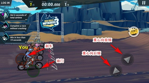 4、开摩托就这几个按键,起手操作推荐:左手按住油门,右手点按重心向前/向后,控制不要摔倒即可。