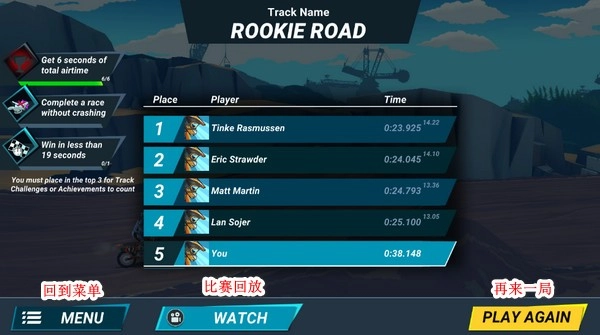 5、这里小编摔了个大跟头,狗啃泥,得了个倒数第一。。这里可以看下刚刚的回放,或者快速再来一把!