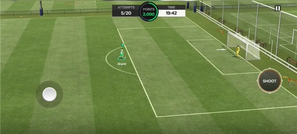 6、使用虚拟操纵杆向网运球,瞄准左角,点击射门按钮得分。