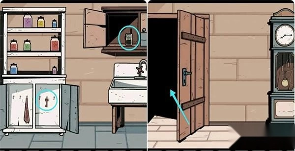 2、打开蓝色的门进入盥洗室,按照片上的提示摆放架子上的罐子,完成后拿走下面的钥匙,接着打开水池上方的柜子拿到对讲机,然后出去用钥匙打架钟表左侧的门。