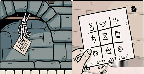 5、来到壁炉那里掀开画框上的白布进入剧情,接着对壁炉使用对讲机收到一张纸条,观察上面的符号,结合收音机的频道数字即可获得四个符号密码。