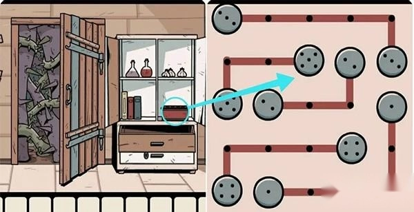 6、输入符号密码打开正大门右边的柜子,再点击右下方的红色盒子完成上面的机关(连连看)即可拿到里面的白色宝石。