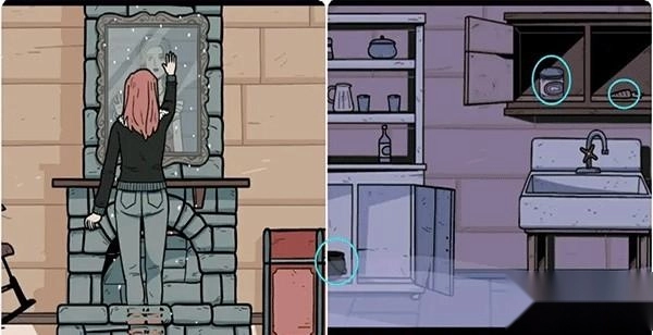 7、将宝石嵌入画框下方的凹槽内来到后面的世界,然后与梅里迪亚对话获取任务,接着到盥洗室搜索道具拿到坩埚、鱼罐头和胡萝卜。
