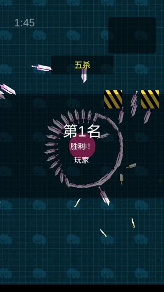 地图不是很大(可能"人"比较少)右上角有显示时间,规定时间结束时场内仍有2人及以上的话,携带刀子数最多者获胜(进行到一定时间会缩小地图,也就是"缩圈")。撞到场景内的障碍物(不包括地图边界)时,刀子会飞掉,和别人撞刀一样的效果。当你的刀子和地图边界发生摩擦时,会无法使用防御模式(也就是说你松开手刀子依然首尾相连围着你绕圈圈)。