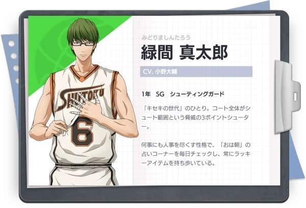 现属秀德高校一年级的王牌选手,原帝光中学篮球部「奇迹的世代」五人中的一人,左手总缠着绷带。 很相信晨间占卜,被人们称为“三分神射手”,曾担任帝光中学篮球部副队长。