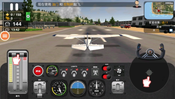 5.如下图,点击画面坐下的“启动”按钮,随后将最左侧的摇杆推到最上,然后拉动右侧的方向盘,让飞机成功起飞,朝着目的地驶去!
