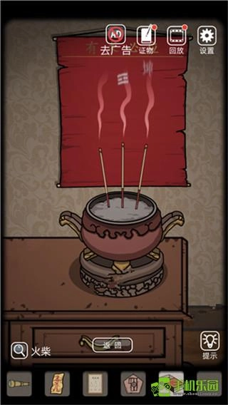 10、接着玩家点击柜子上的的香炉,插上三根香,随后使用火柴点燃,可以获得线索风、坤