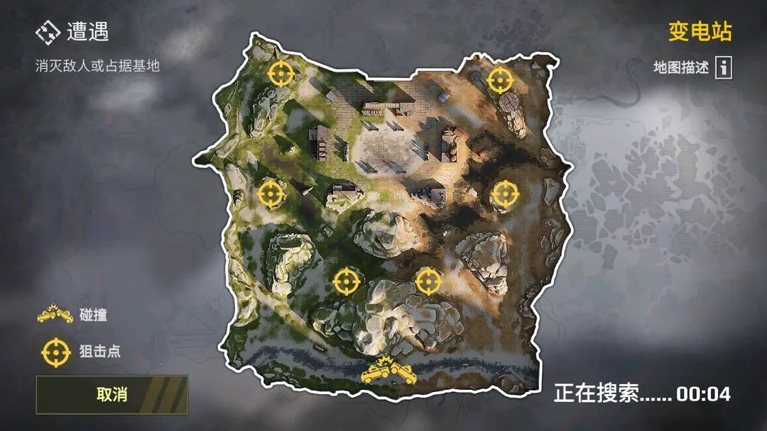 地图上会展示一些简易信息:如狙击点和碰撞点等。顾名思义:狙击点是适合使用远程火力投射武器,进行狙击的位置,而碰撞点则是适合进行近距离战车格斗战的地方。