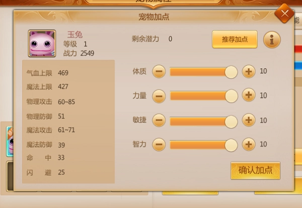 宠物升级可以获得潜力点,潜力点可以手动分配到宠物的基础属性上面。