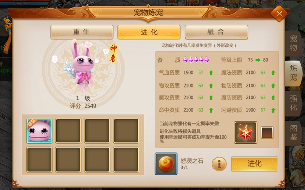 2、宠物在25、35、45、55、65级分别可以进化一次,进化有一定成功率。如果在前期没有进化,后期可以进化的总次数不会减少,例如25级时候没有进化,那么在35级时候可以成功进化2次,或者之前一直没有进化,到65级才进化,可以进化5次。