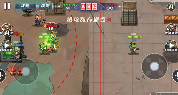2、进入后左侧虚拟摇杆控制红方移动,右侧操控蓝方行动。