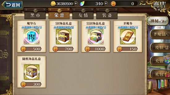 在黑市中可以购买到很多养成相关的道具,需要花费一定的金币来购买。还可以花费少量圣魔晶购买英雄碎片。