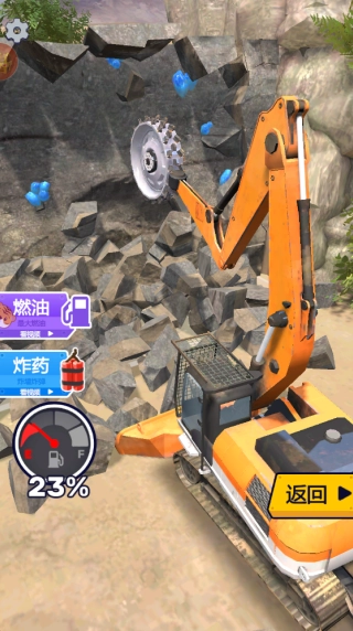 2、用赚取的金币解锁下一台工程车,驾驶新车辆在矿场中铲挖石头,自由调整移动方向。