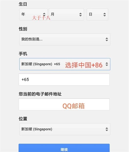 3、打开谷歌商店注册账号,在选择的时候选择中国+86,邮箱也可以选择国内邮箱,位置栏选择新加坡。