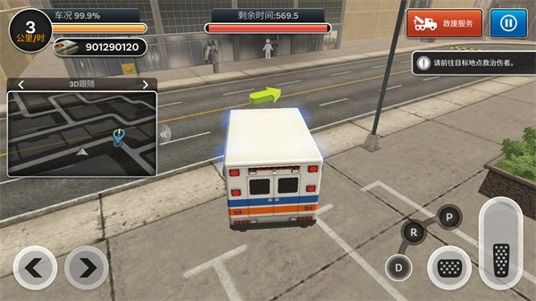 3、驾驶急救车时关注剩余时间,跟随导航前往目标点,及时救治伤者。