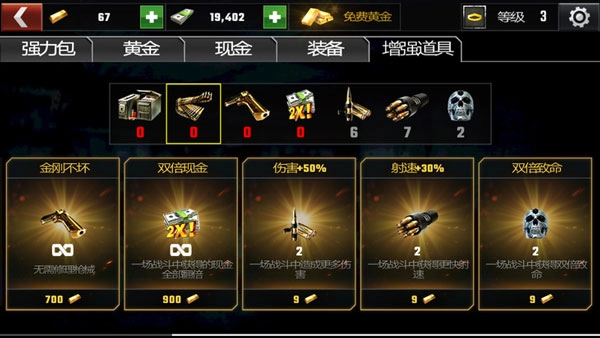 需要升级才能解锁更强力的枪支,并需要黄金购买才能使用。开始送一把初始的手枪和冲锋枪,使用现金升级,升级次数也是受玩家等级影响。在无法购买后续的枪支时,升级已有的枪支是不错的选择。